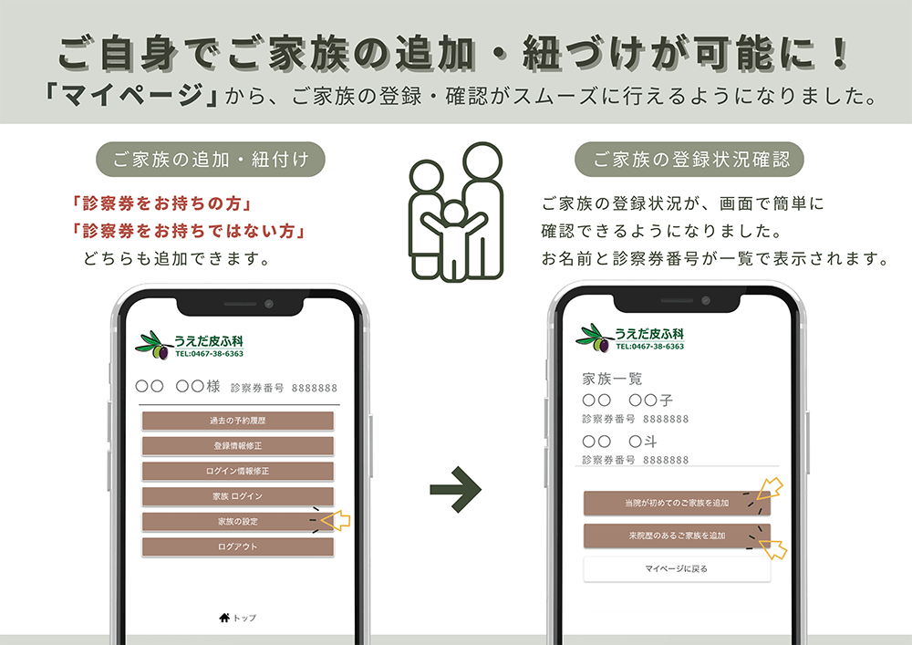 受診される人数分の予約が必要です。LINE予約・WEB予約をご利用の方は、「マイページ」よりご自身でご家族の追加登録ができます。