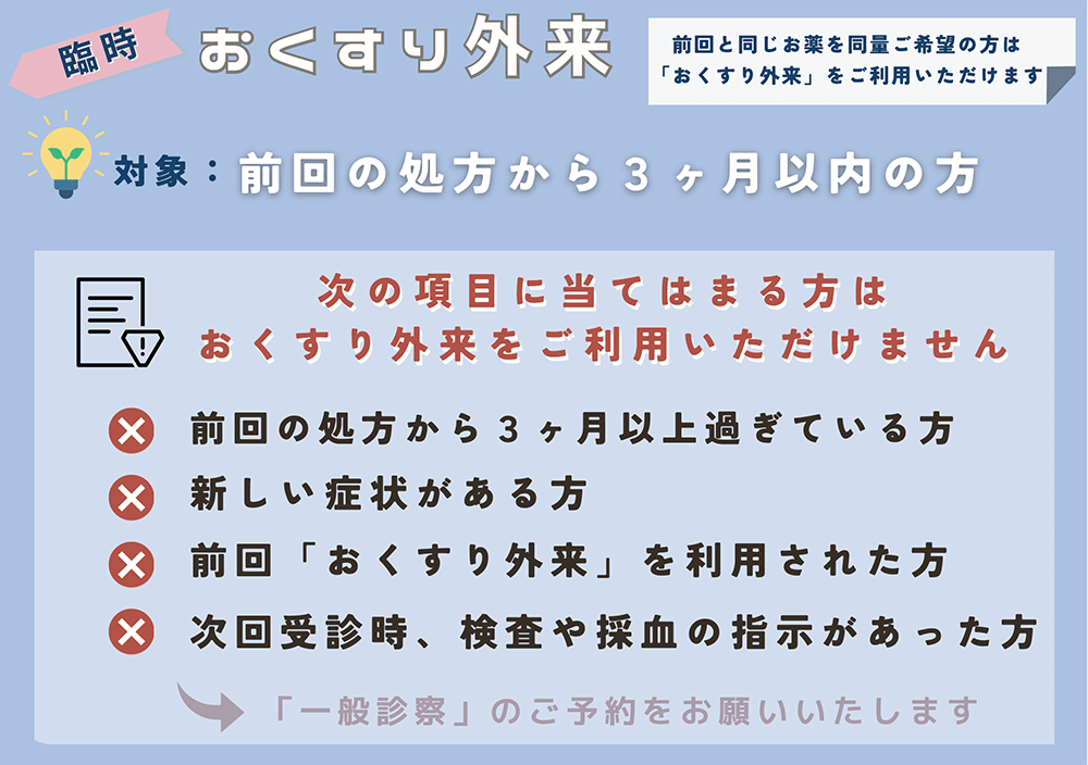 一般診察のご予約が難しい状況が続いているため、臨時で「おくすり外来」を開設しております。
